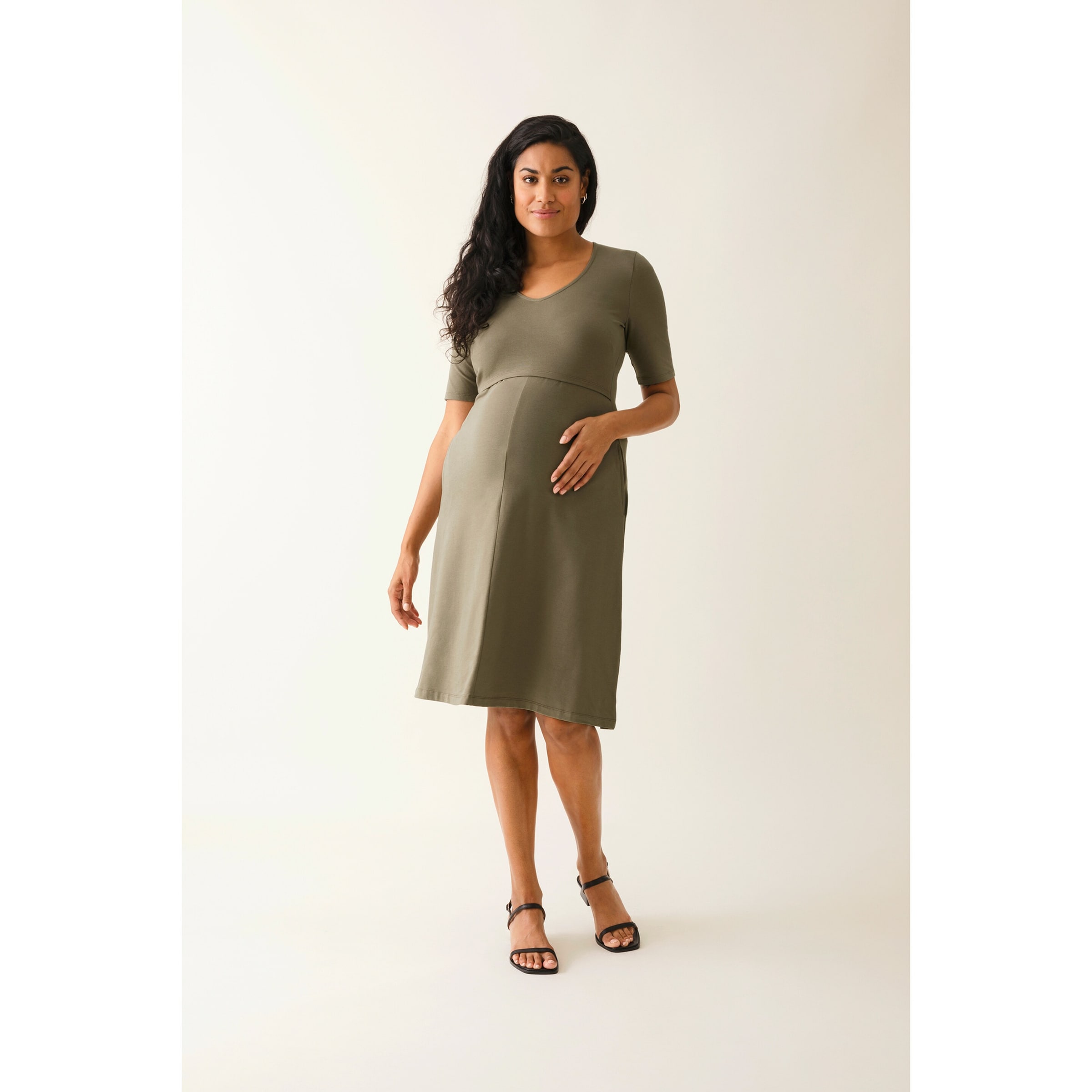 | Design-Merkmale | Integriertes Still-Design mit überlappendem V-Ausschnitt für diskretes Stillen. Fließende A-Linie, die den wachsenden Bauch umschmeichelt. Knielange oder wadenlange Variante je nach Modell verfügbar. |