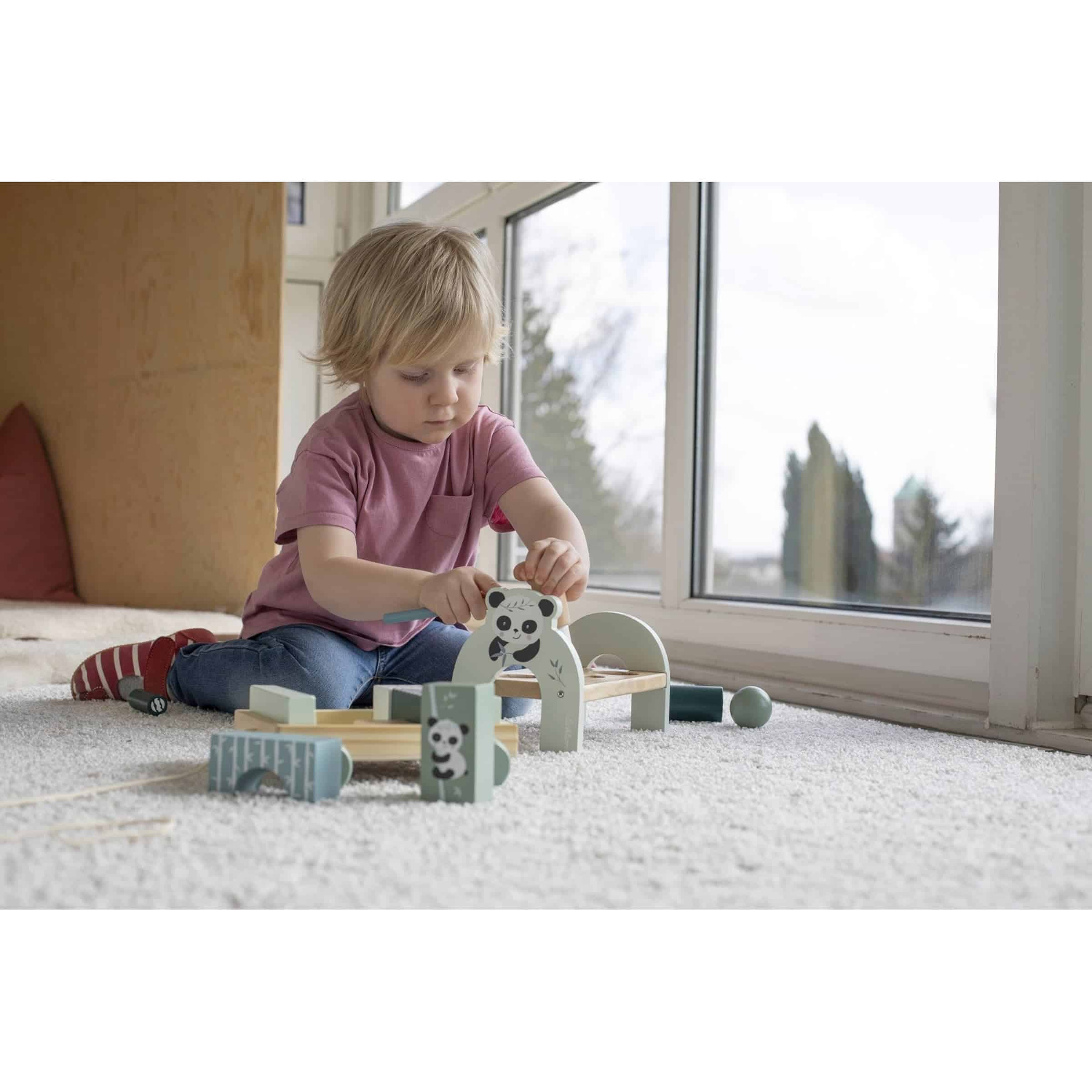 | Design | Charmanter Panda-Look mit freundlichen Gesichtszügen und bunten Akzenten an den Holzdübeln. Abgerundete Kanten und glatte Oberflächen für maximale Kindersicherheit. |