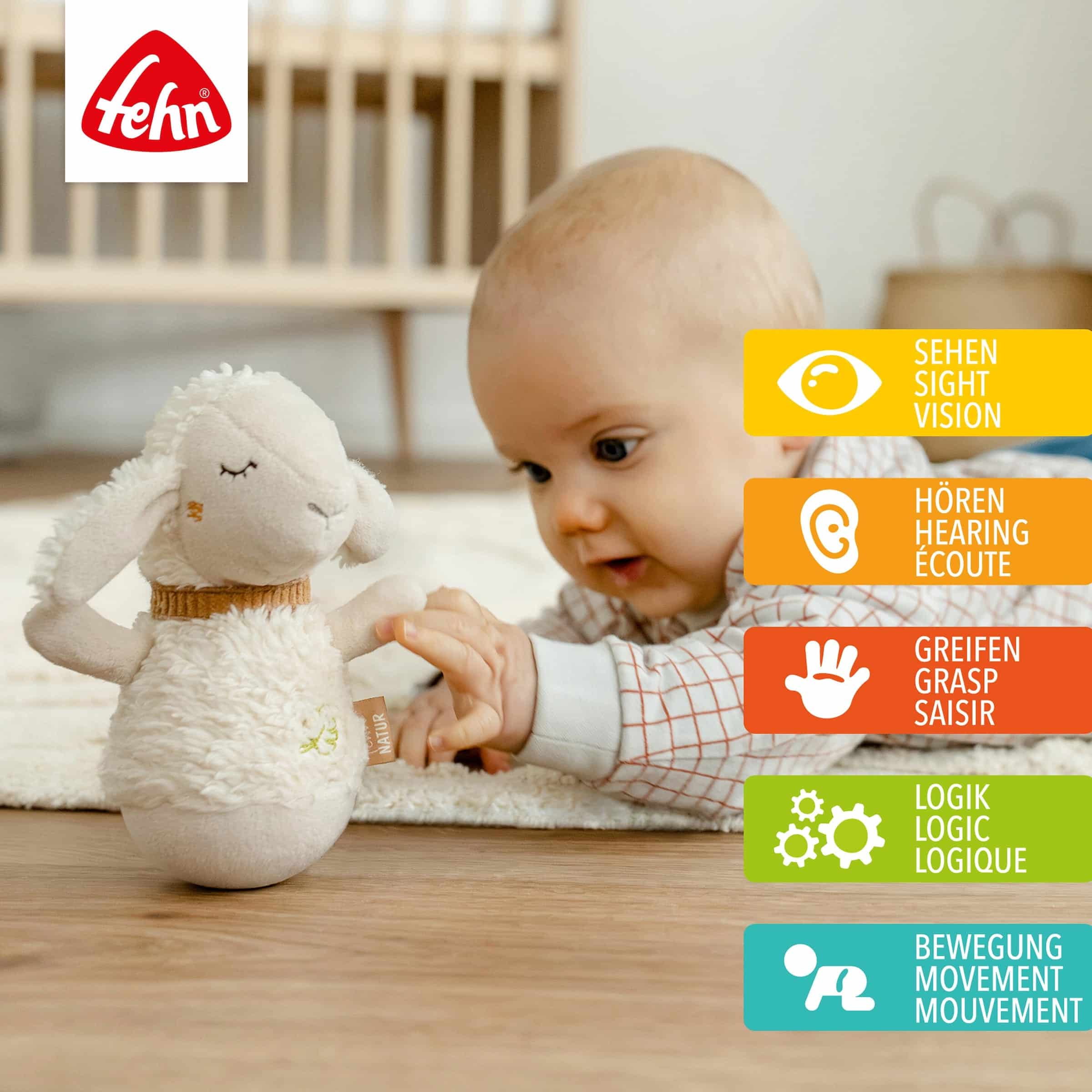 Das Fehn Mini-Stehauf Schaf fehnNATUR ist bereits für Babys ab den ersten Lebensmonaten (0+ Monate) geeignet. In diesem Alter beginnen Babys, ihre Umgebung intensiv mit den Sinnen wahrzunehmen und erste Greifversuche zu unternehmen. Das Stehauf-Prinzip fasziniert bereits die Kleinsten.