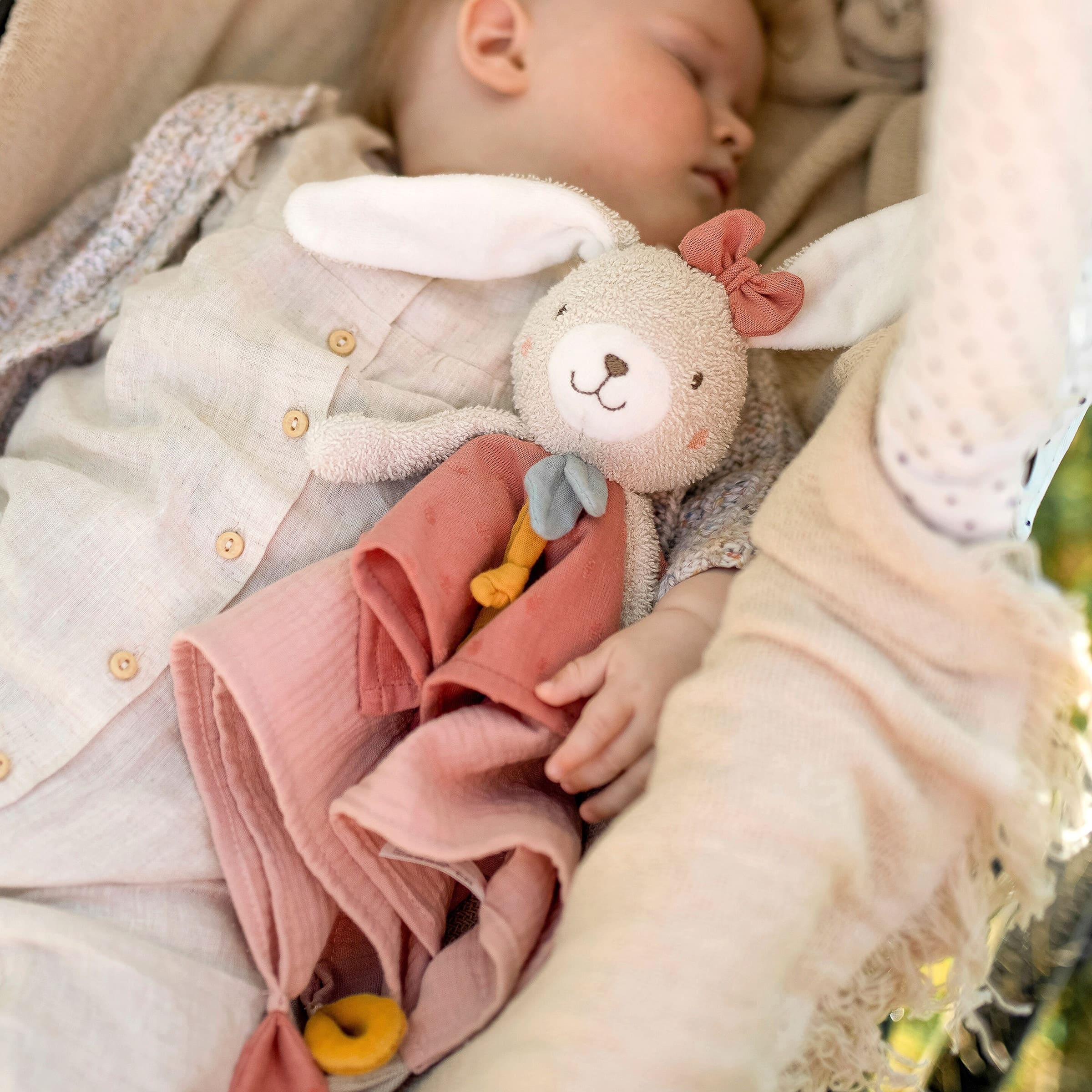 - Tastsinn: Die unterschiedlichen Oberflächen der Bio-Baumwolle – vom weichen Fell des Hasen bis zum leicht strukturierten Stoff des Tuchs – laden zum Ertasten und Erkunden ein. Dies schult den Tastsinn und die Feinmotorik.