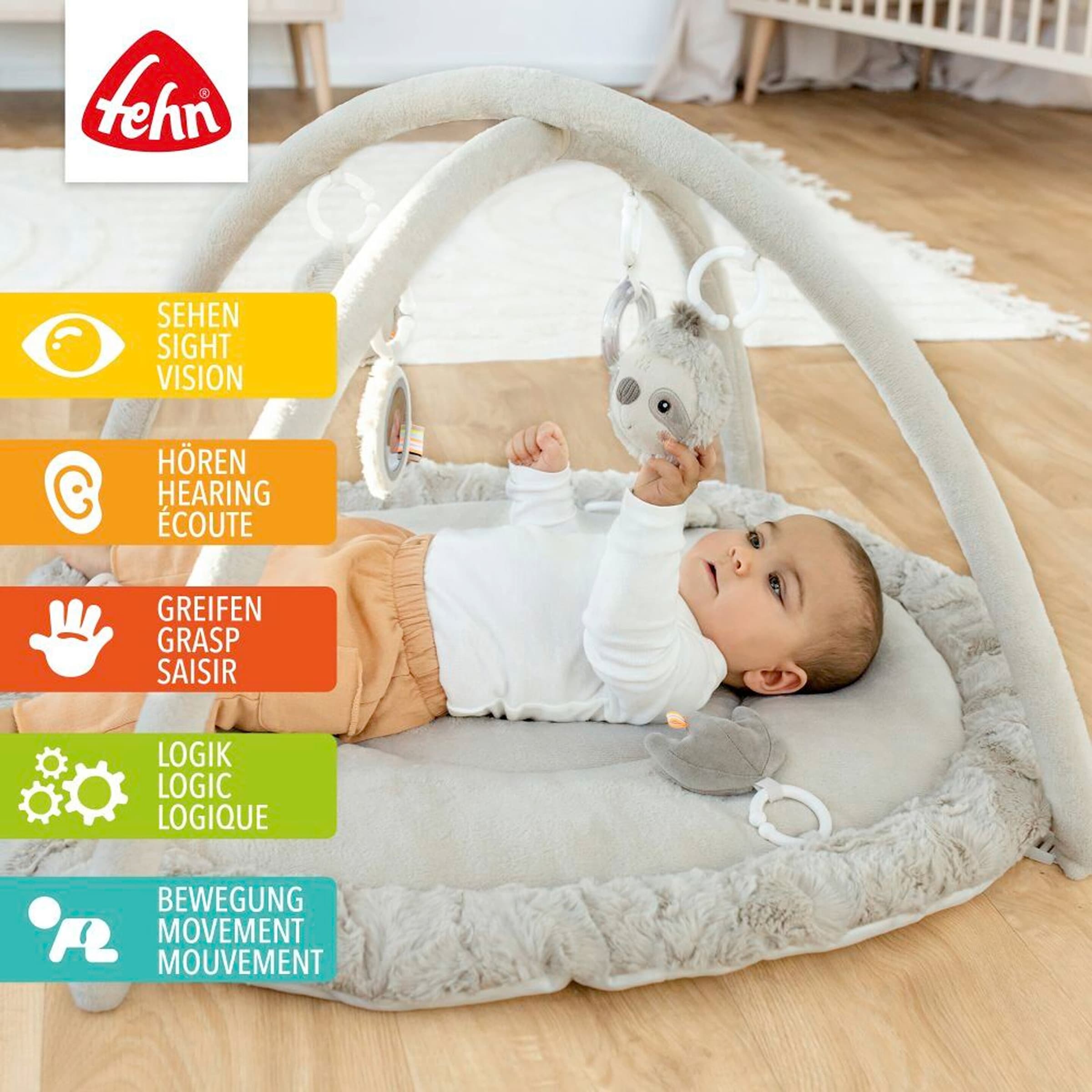Spielspaß und Entwicklung für Ihr Baby: Der Fehn Spielbogen mit 3-D-Activity-Decke Faultier