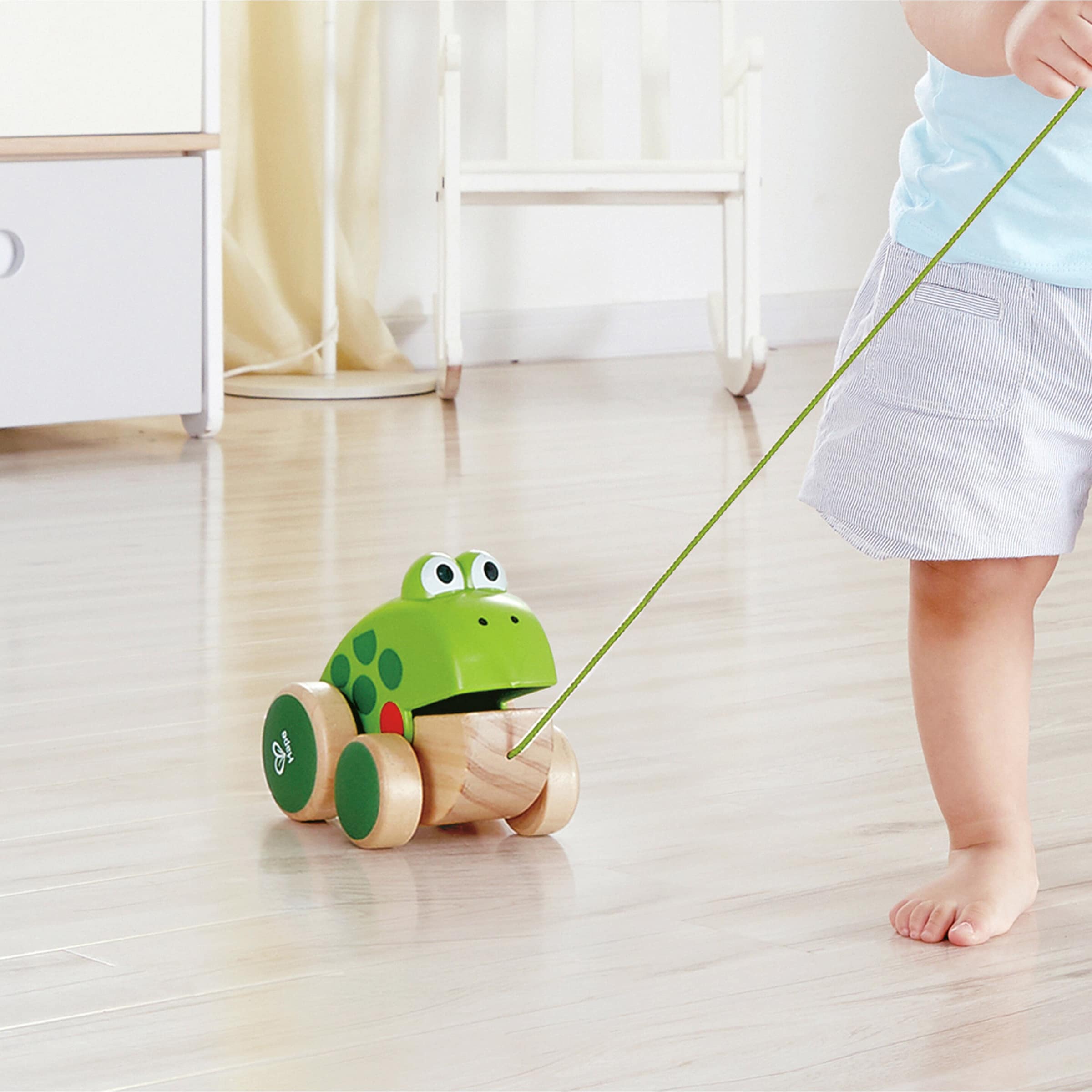 | Design-Merkmale | Der Frosch Fridolin ist mit freundlich gestalteten Augen und einem Lächeln versehen, um eine positive emotionale Bindung zu fördern. Die Räder sind stabil angebracht und laufen leichtgängig, um ein sanftes Rollen auf verschiedenen Oberflächen zu ermöglichen. Die Schnur ist so dimensioniert, dass sie für kleine Hände gut zu greifen ist und eine angemessene Länge für das Nachziehen bietet. |