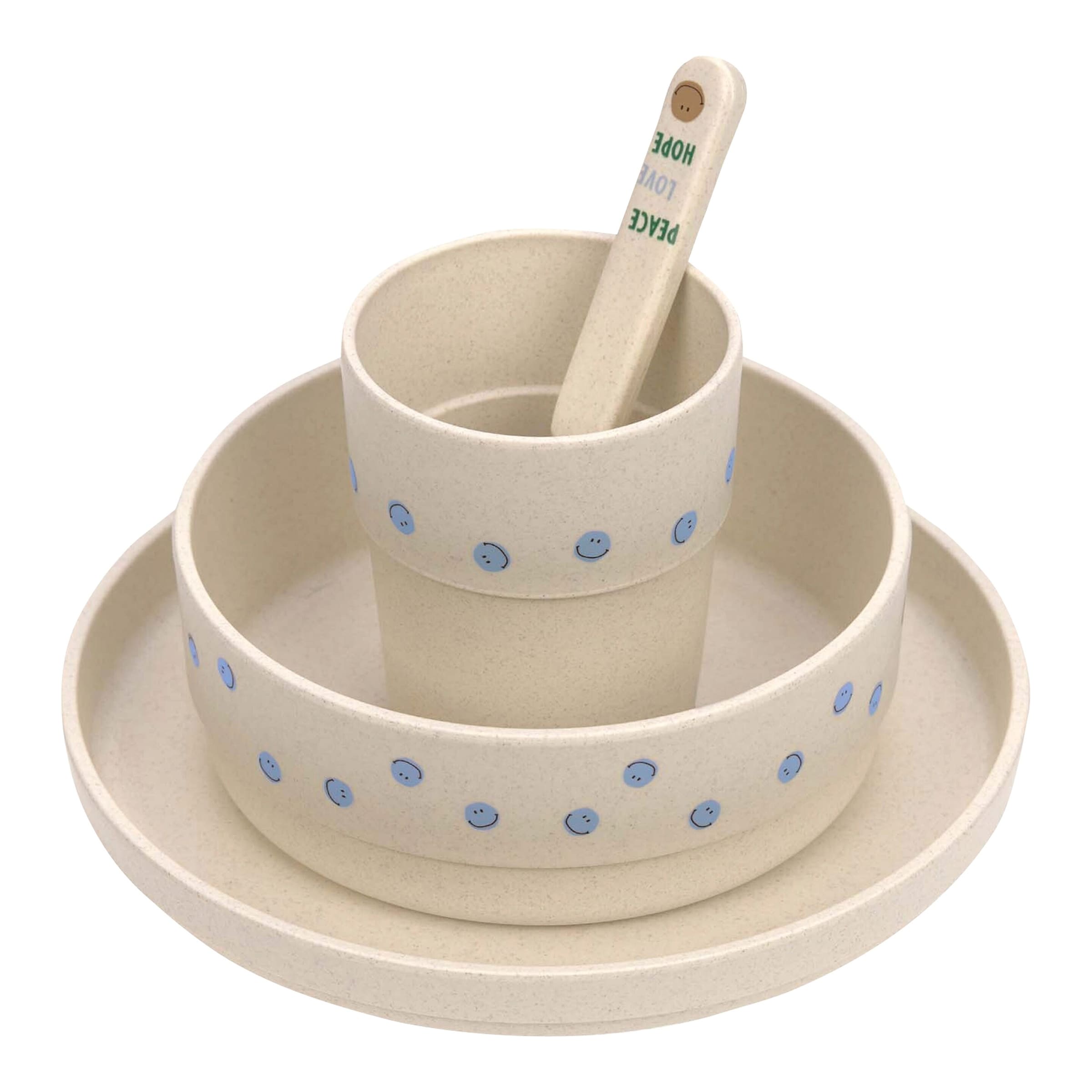 Der genaue Lieferumfang kann variieren, aber typischerweise beinhaltet das Set einen Teller, eine Schüssel, einen Becher und ein Besteckset (Löffel und Gabel).