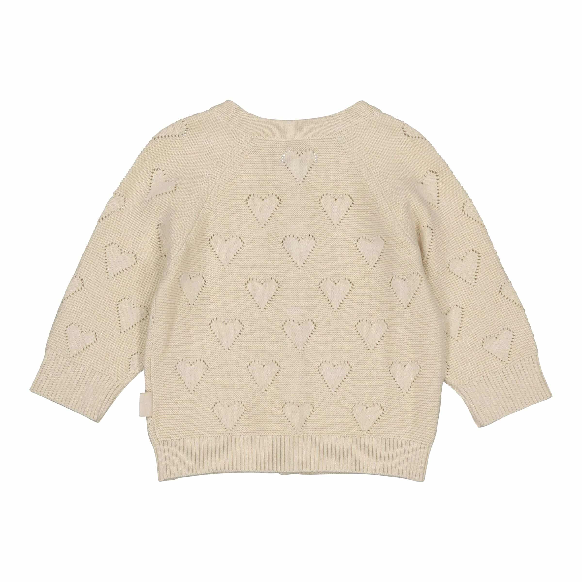| Design-Merkmale | Filigranes Ajour-Strickmuster, charmante Herz-Applikationen, durchgehende Knopfleiste, abgerundeter Kragen |