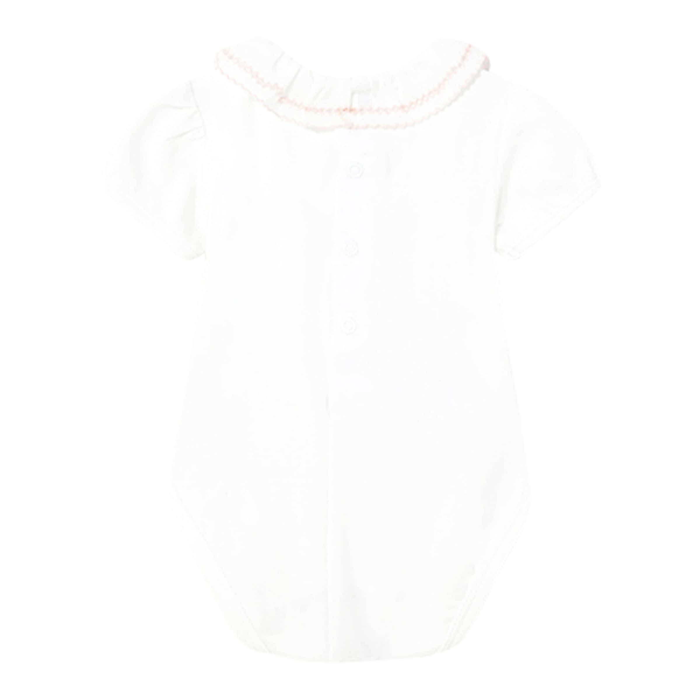 | Design-Merkmale | Kurzarm, aufwendig gestalteter Rüschenkragen, Druckknopfleiste im Schrittbereich |