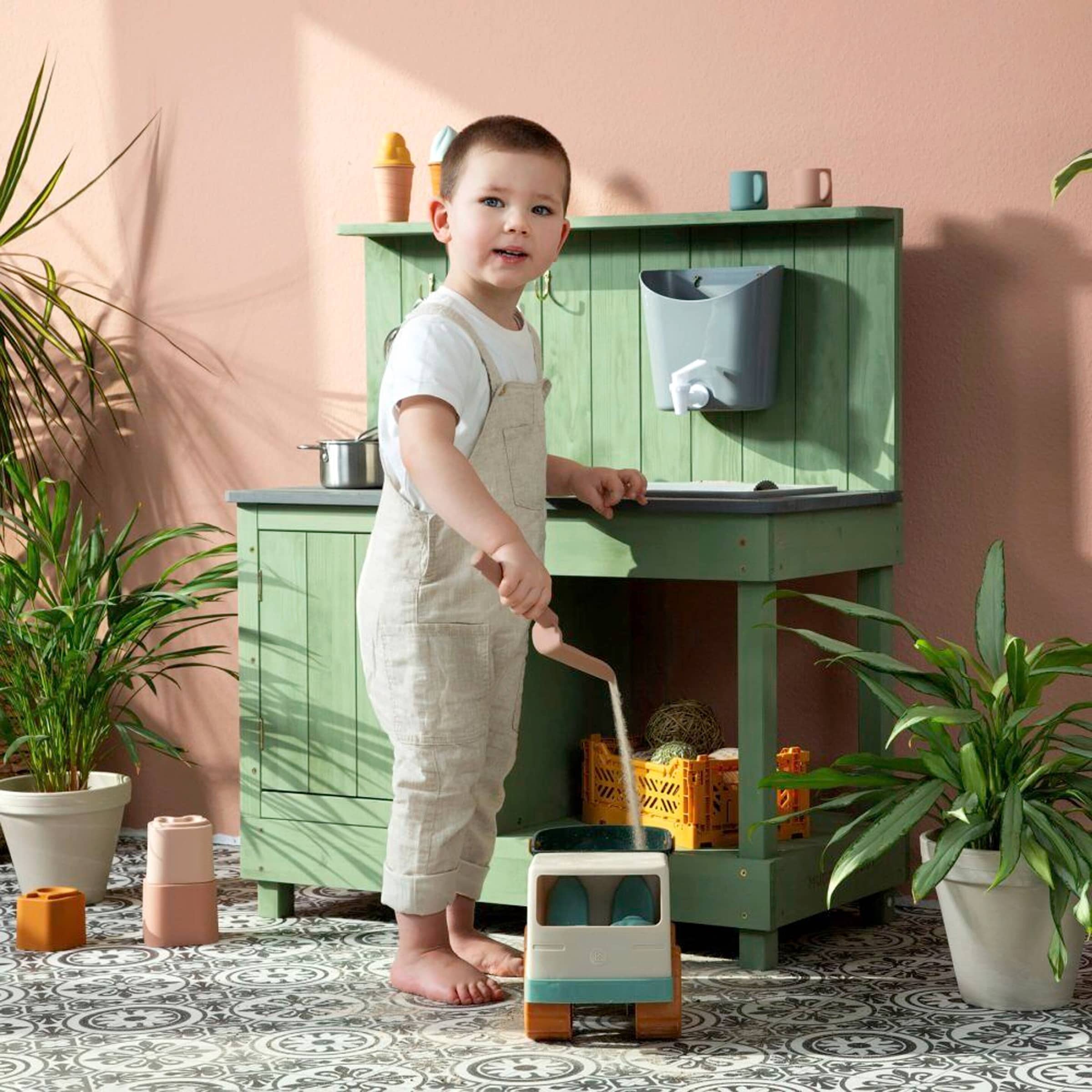 Wir ermutigen zu einem kreativen Umgang mit natürlichen Materialien. Dazu gehören Erde, Sand, Wasser, Blätter, Blüten, kleine Äste, Steine und alles, was die Natur zu bieten hat. Die Oberfläche der Matschküche ist leicht zu reinigen, sodass der Fantasie keine Grenzen gesetzt sind.