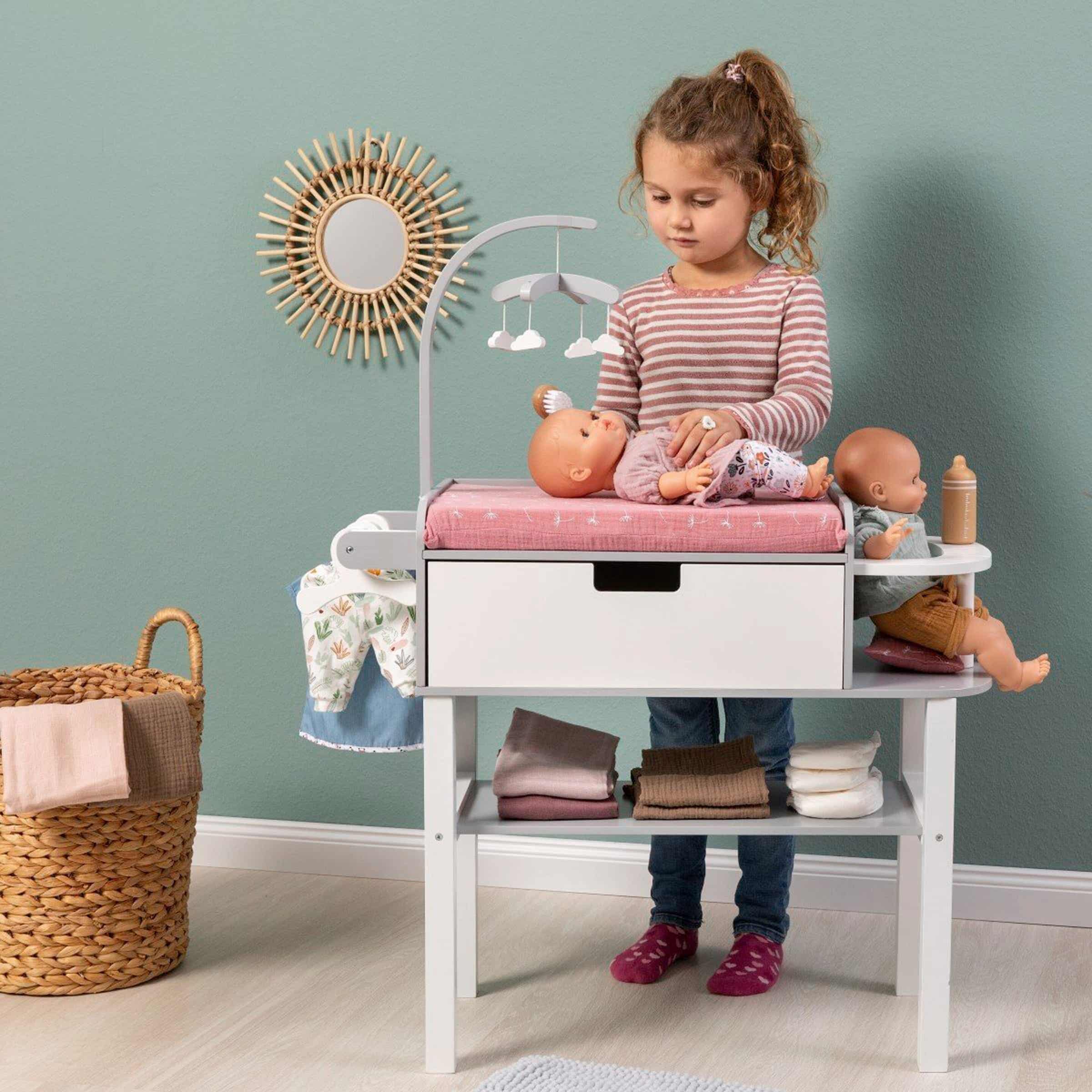 - Realitätsnahes Spielerlebnis: Mit einer großzügigen Wickelfläche, integrierten Fächern für Puppenzubehör und einer durchdachten Anordnung von Regalen und Schubkästen bietet die Viola-Kommode ein authentisches Setting für Puppenpflege.
