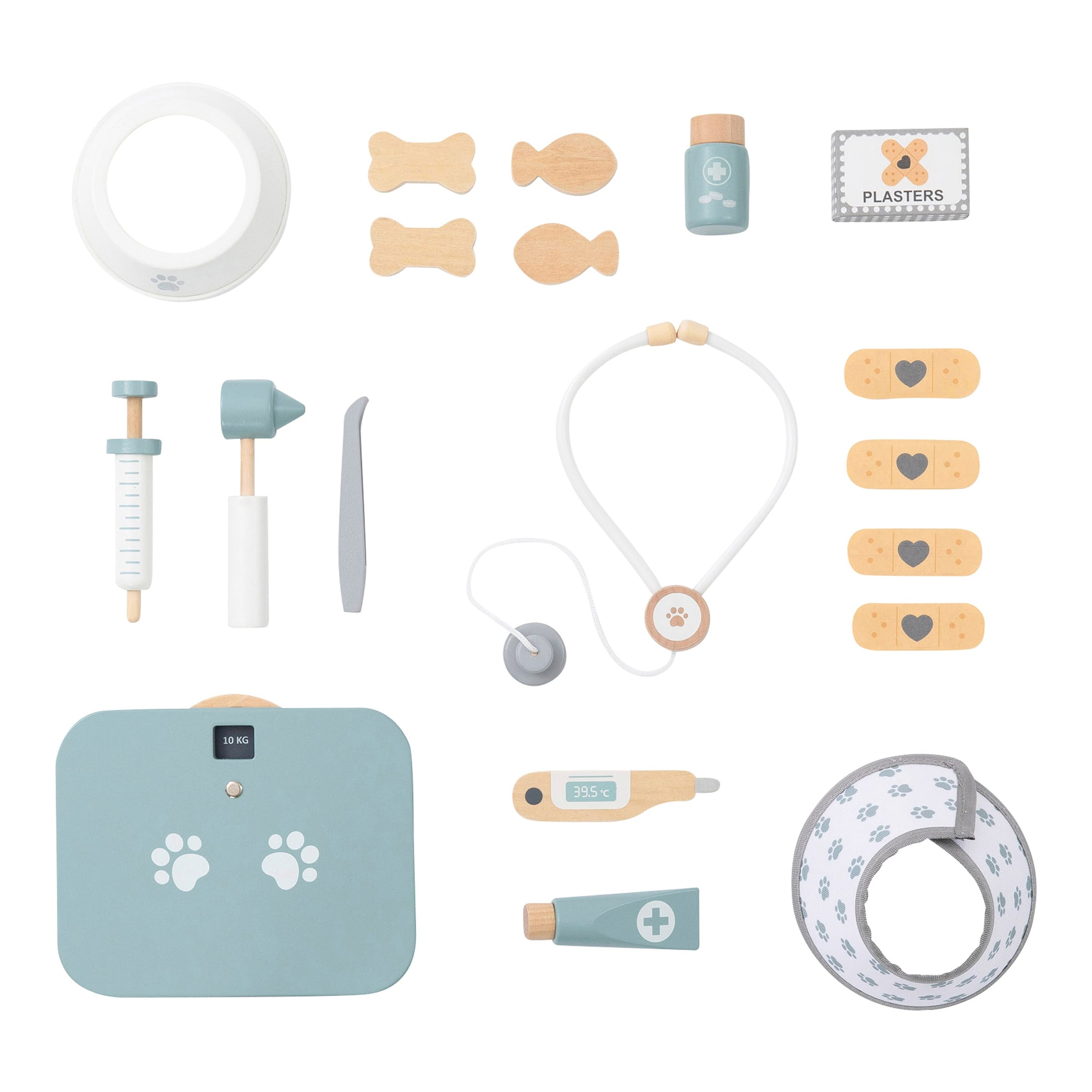 | Materialien | Hochwertiges, langlebiges und schadstofffreies Holz für die Spielgeräte wie Stethoskop und Spritze. Textilmaterialien für die Tierfiguren und Verbandsmaterialien sind robust und leicht zu reinigen. Die Oberflächen sind kindgerecht lackiert oder behandelt. |