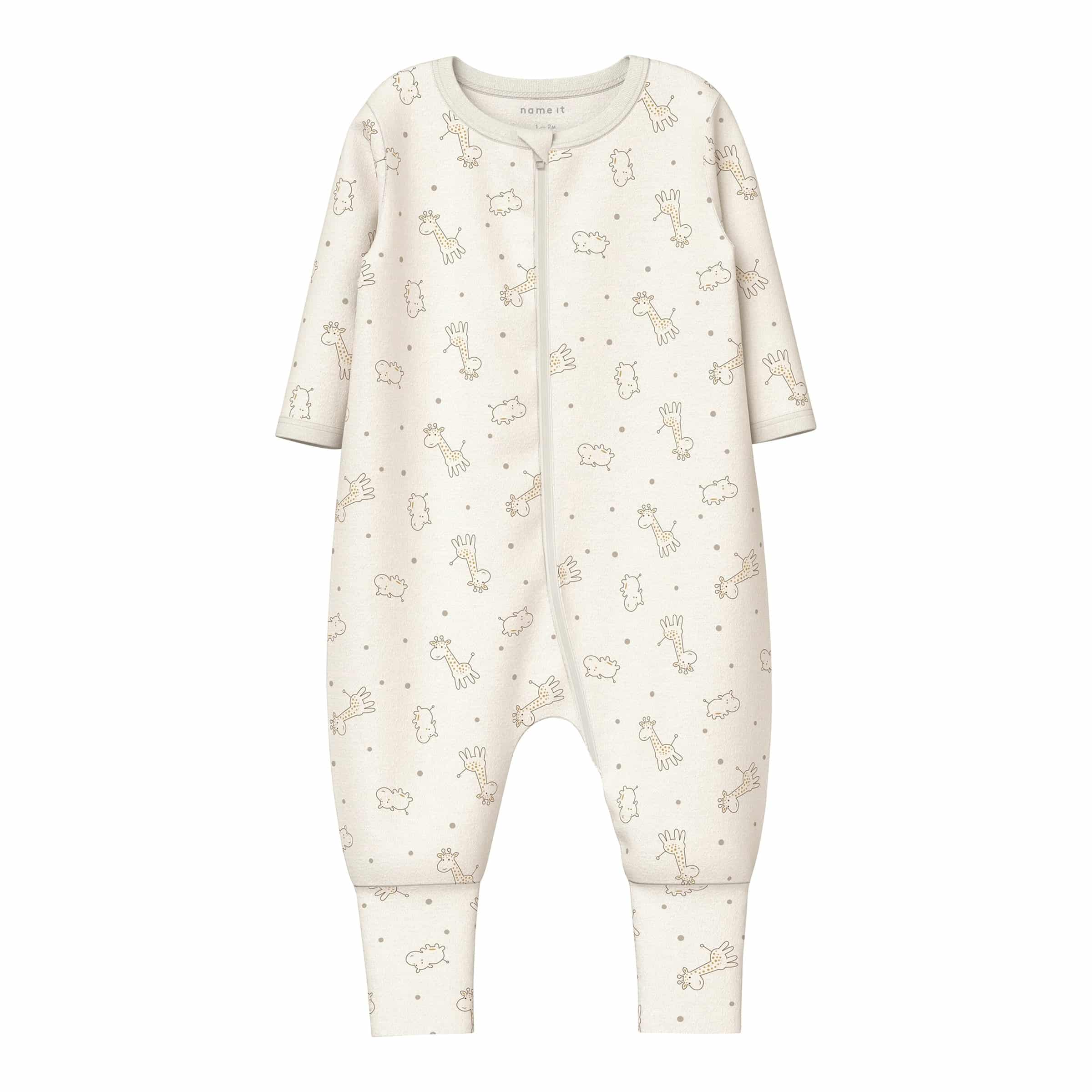 | Design-Merkmale | Durchgehender Reißverschluss mit Kinnschutz, integrierte Klappfüße, flache Nähte, Giraffen-Allover-Print. |