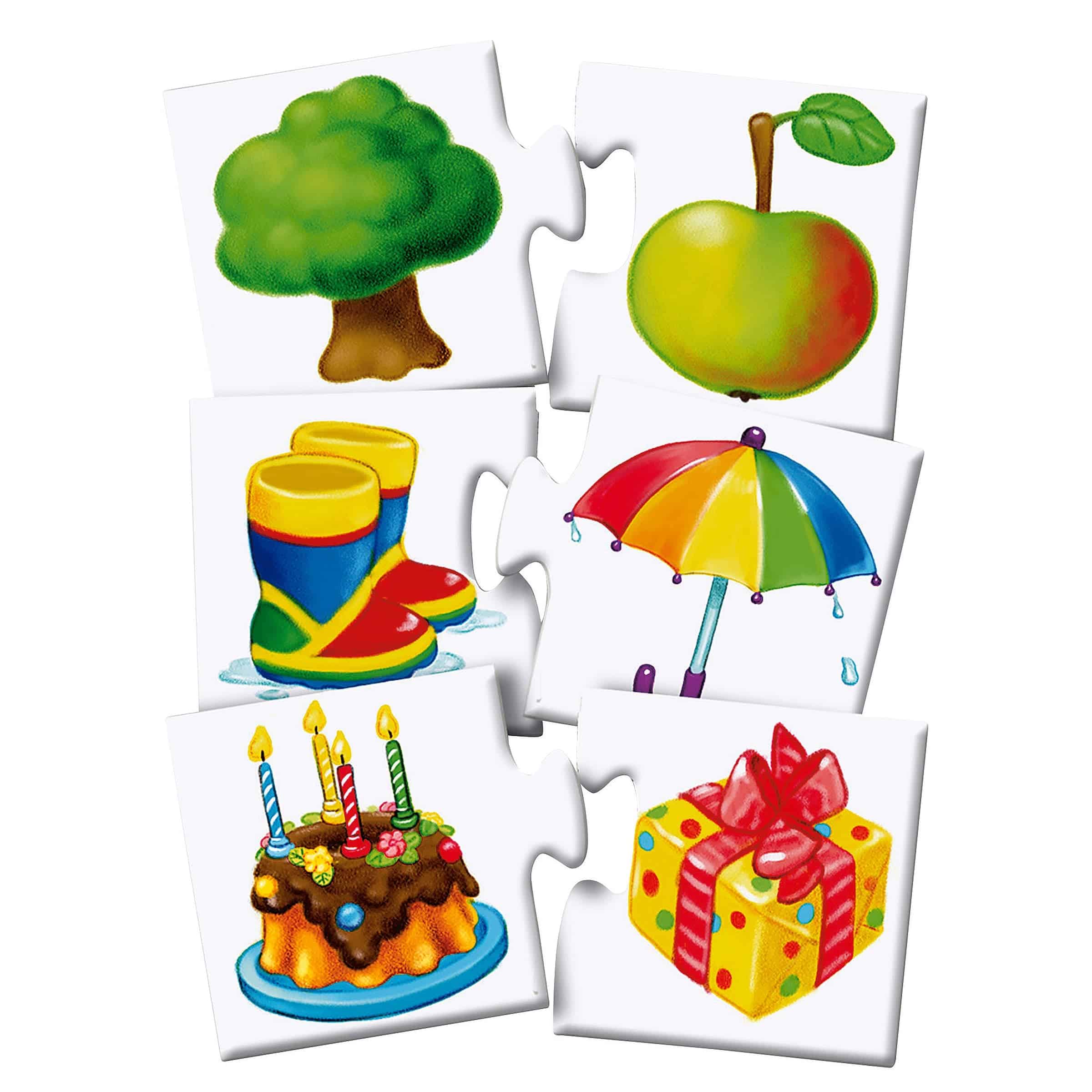 | Inhalt (Beispiele für Kategorien) | Tierfamilien (Hund/Welpe, Katze/Kätzchen), Kleidung (Schuh/Schnürsenkel), Werkzeuge (Hammer/Nagel), Lebensmittel (Brot/Butter), Verkehrsmittel (Auto/Rad), Naturphänomene (Sonne/Wolke), Haushaltsgegenstände (Tasse/Untertasse). Die spezifischen Themen variieren je nach Ausführung, sind aber immer didaktisch aufeinander abgestimmt. |