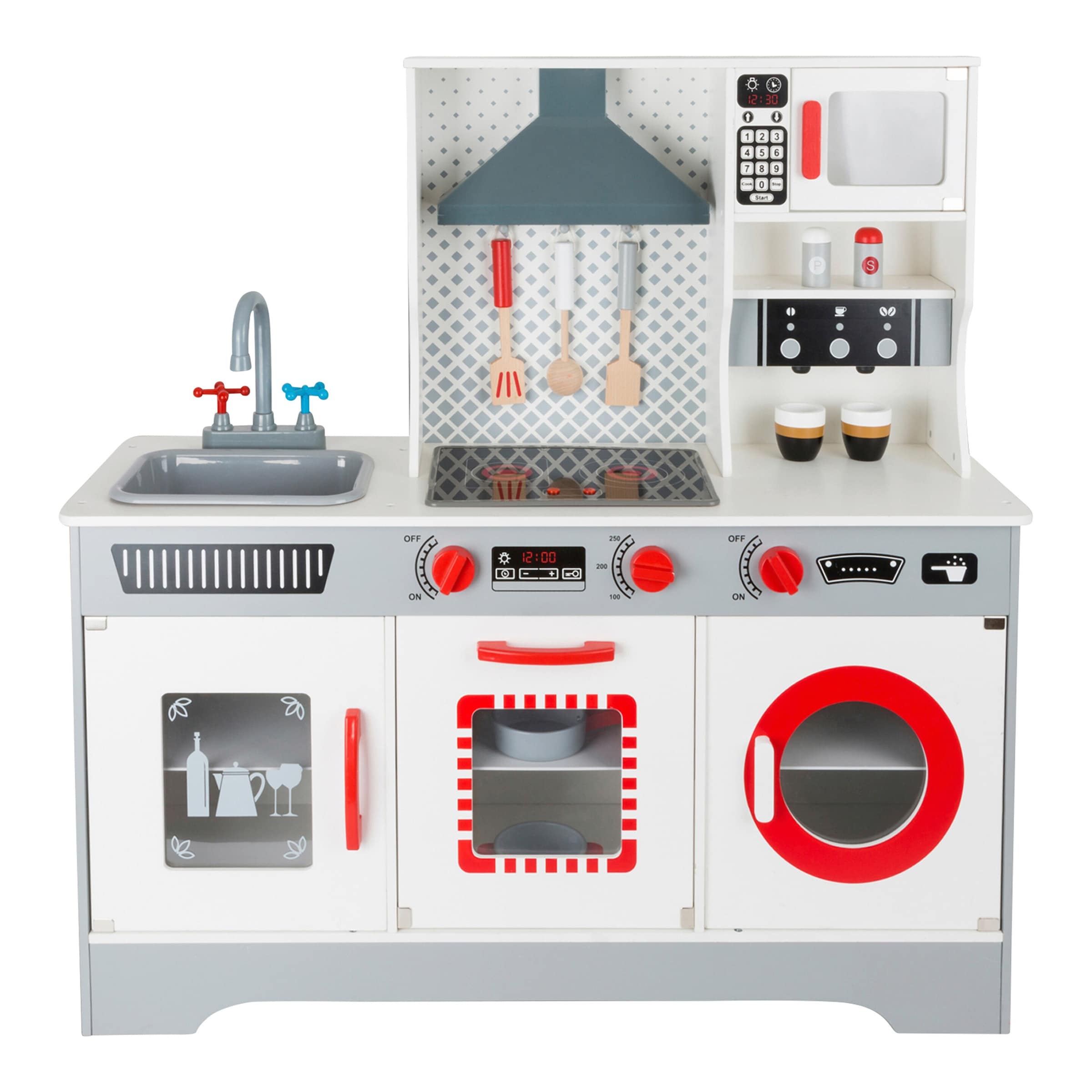 | Design-Merkmale | Authentisches Küchendesign mit Kochplatte, Backofen, Spüle und Hähnen, drehbare Knöpfe mit Klickfunktion, Stauraum. |