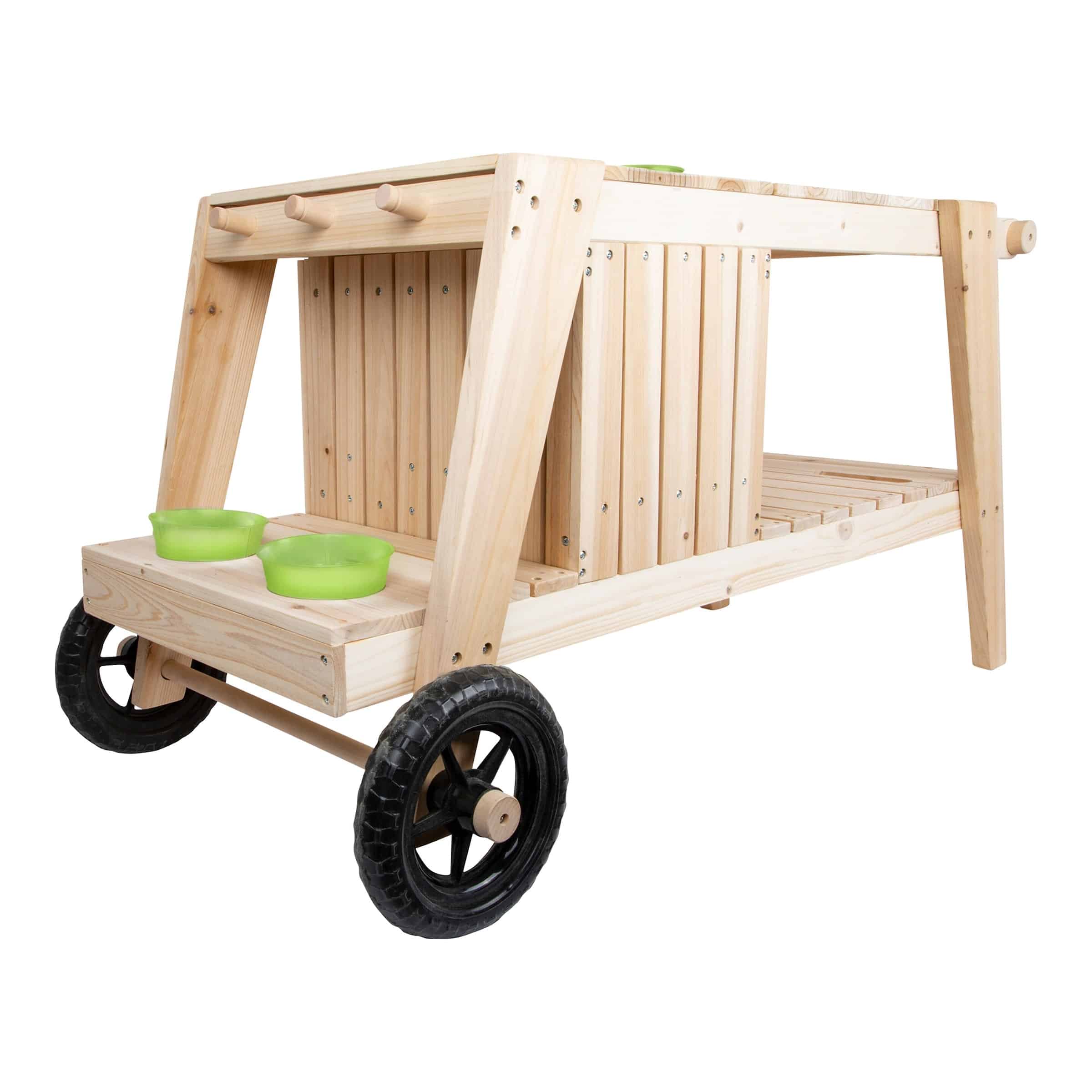 | Design-Merkmale | Oftmals mit integrierten Arbeitsflächen, Waschbecken (kann mit Wasser gefüllt werden), Regalen für Utensilien und Aufbewahrungsboxen für Matsch-Zutaten ausgestattet. Ergonomische Arbeitshöhe für Kinder. |