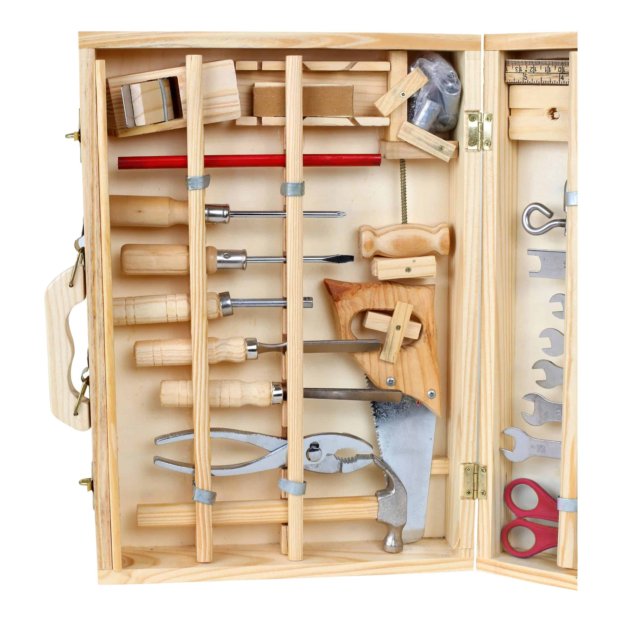 | Material (Hauptbestandteile Werkzeuge) | Hochwertiges Massivholz (z.B. Buche, Linde) mit kindgerecht gestalteten Metallapplikationen für Schraubenköpfe und Griffflächen. Klarlackierung auf Wasserbasis für Oberflächenschutz und Haptik. |
