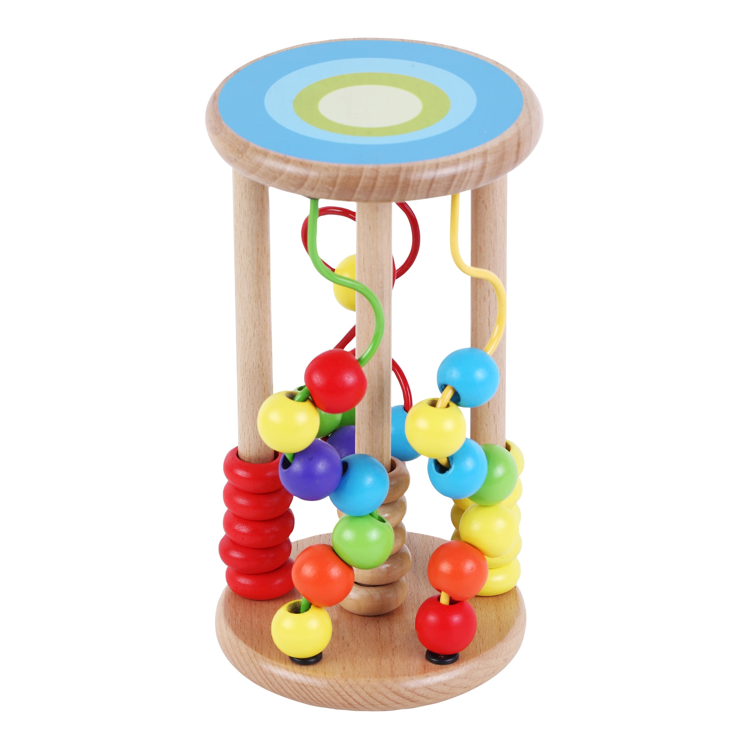 | Design-Merkmale | Das Spielzeug präsentiert sich mit einem stabilen Holzrahmen, der mehrere metallische Drähte beherbergt, auf denen unterschiedlich geformte und farbige Holzperlen aufgefädelt sind. Diese sind so konzipiert, dass sie sich leicht greifen lassen, aber auch eine gewisse Herausforderung darstellen, um sie über die Drähte zu schieben. Die Farben sind leuchtend und kindgerecht, um visuell ansprechend zu sein und die Farberkennung zu fördern. |