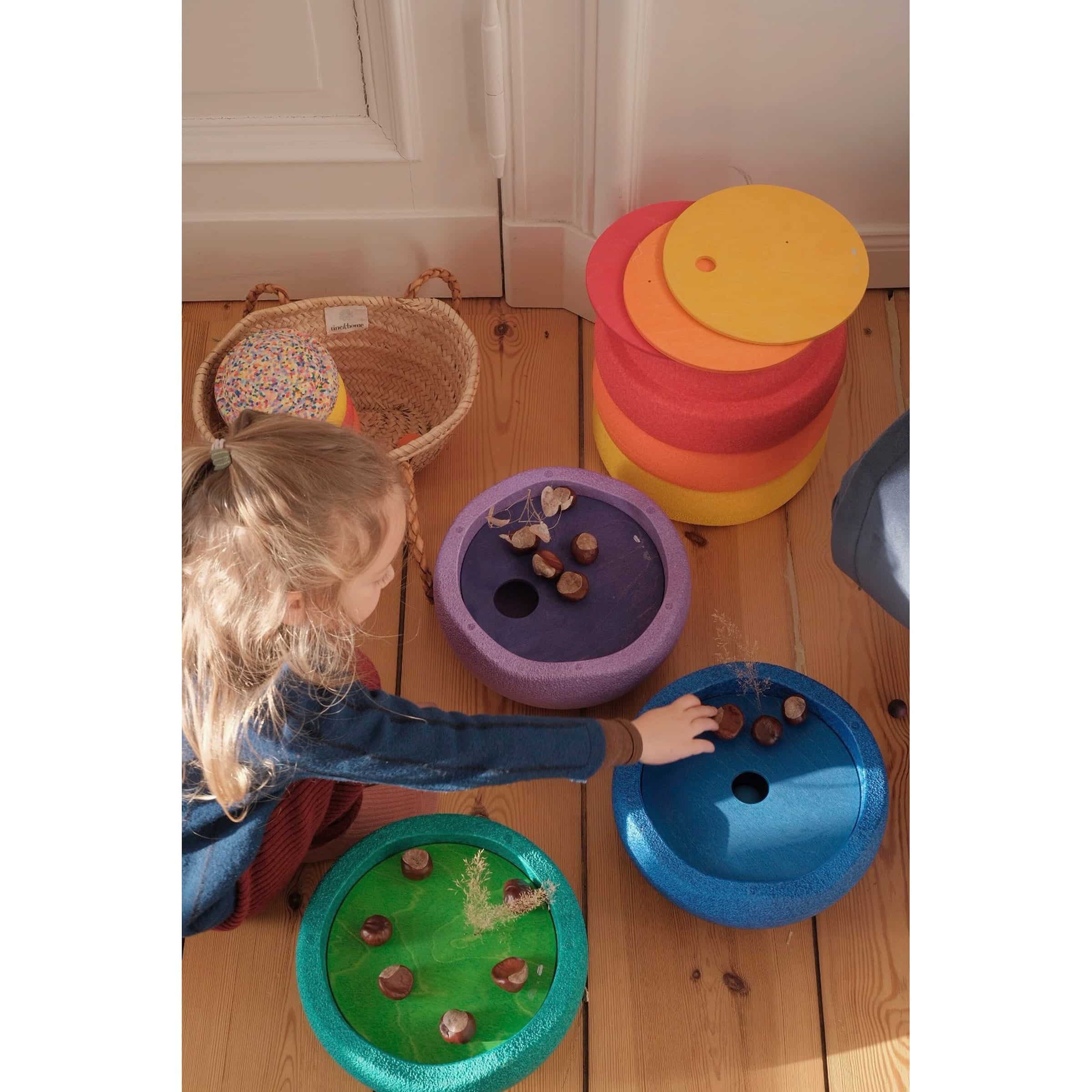- Stärkung des Gleichgewichtssinns und der Körperwahrnehmung: Die Stapelsteine laden zum Balancieren und Bewegen ein. Kinder lernen, ihren Schwerpunkt zu finden, ihren Körper zu stabilisieren und Risiken einzuschätzen. Dies ist entscheidend für die motorische Entwicklung und das Selbstvertrauen.