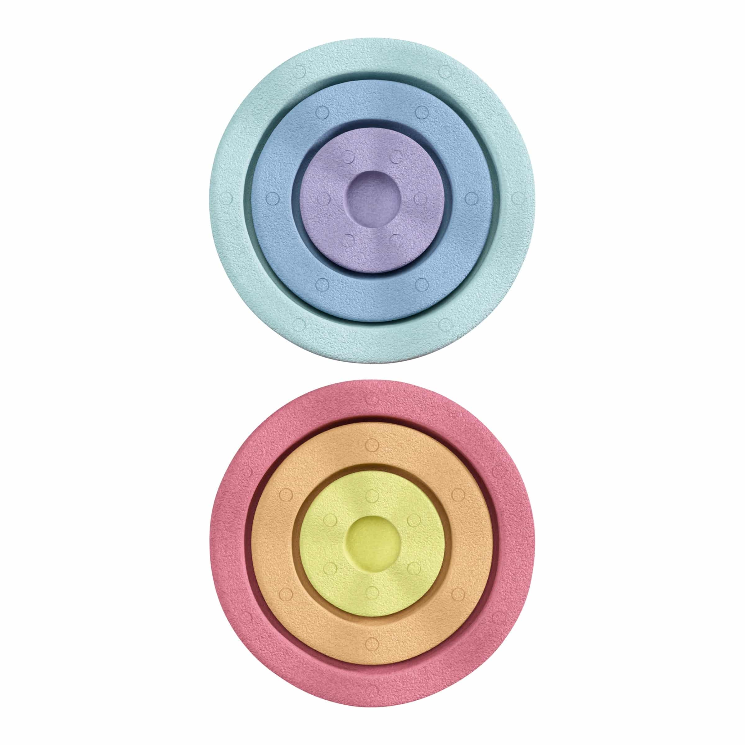 | Design-Merkmale | Set „Inside rainbow“ bestehend aus mehreren Stapelsteinen in leuchtenden Regenbogenfarben, die innen hohl sind. Die ikonische Form mit wellenförmigen Kanten ermöglicht ein nahtloses Ineinanderstapeln und Kombinieren mit anderen Stapelstein-Elementen. |
