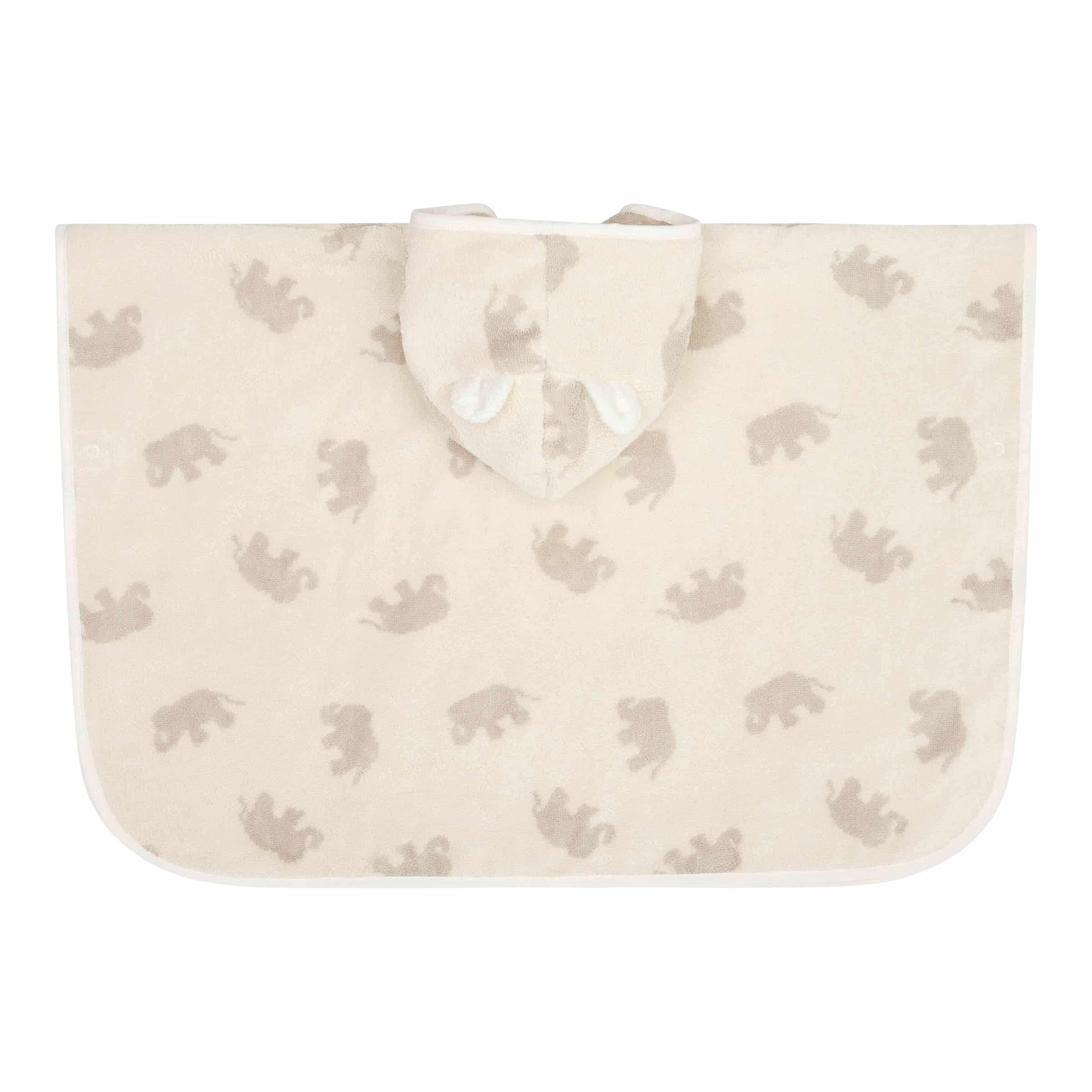 | Design-Merkmale | Poncho-Form mit integrierter Kapuze, dezentes Elefanten-Motiv in Weiss |