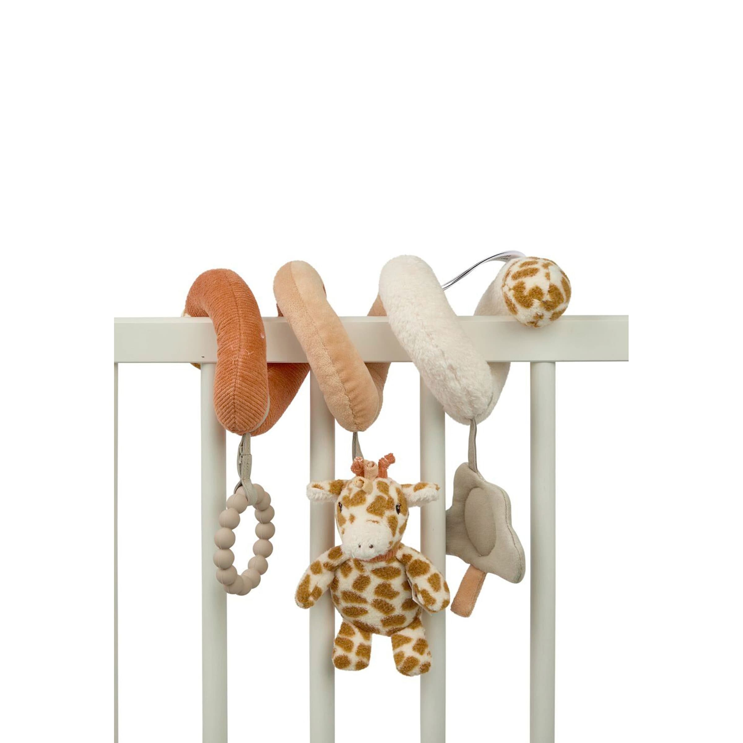 - Greif- und motorische Fähigkeiten: Die spiralförmige Form lädt zum Greifen und Festhalten ein. Das Baby übt, nach den verschiedenen Elementen zu greifen, diese zu untersuchen und zu manipulieren, was die Entwicklung der Feinmotorik und Hand-Auge-Koordination entscheidend unterstützt.