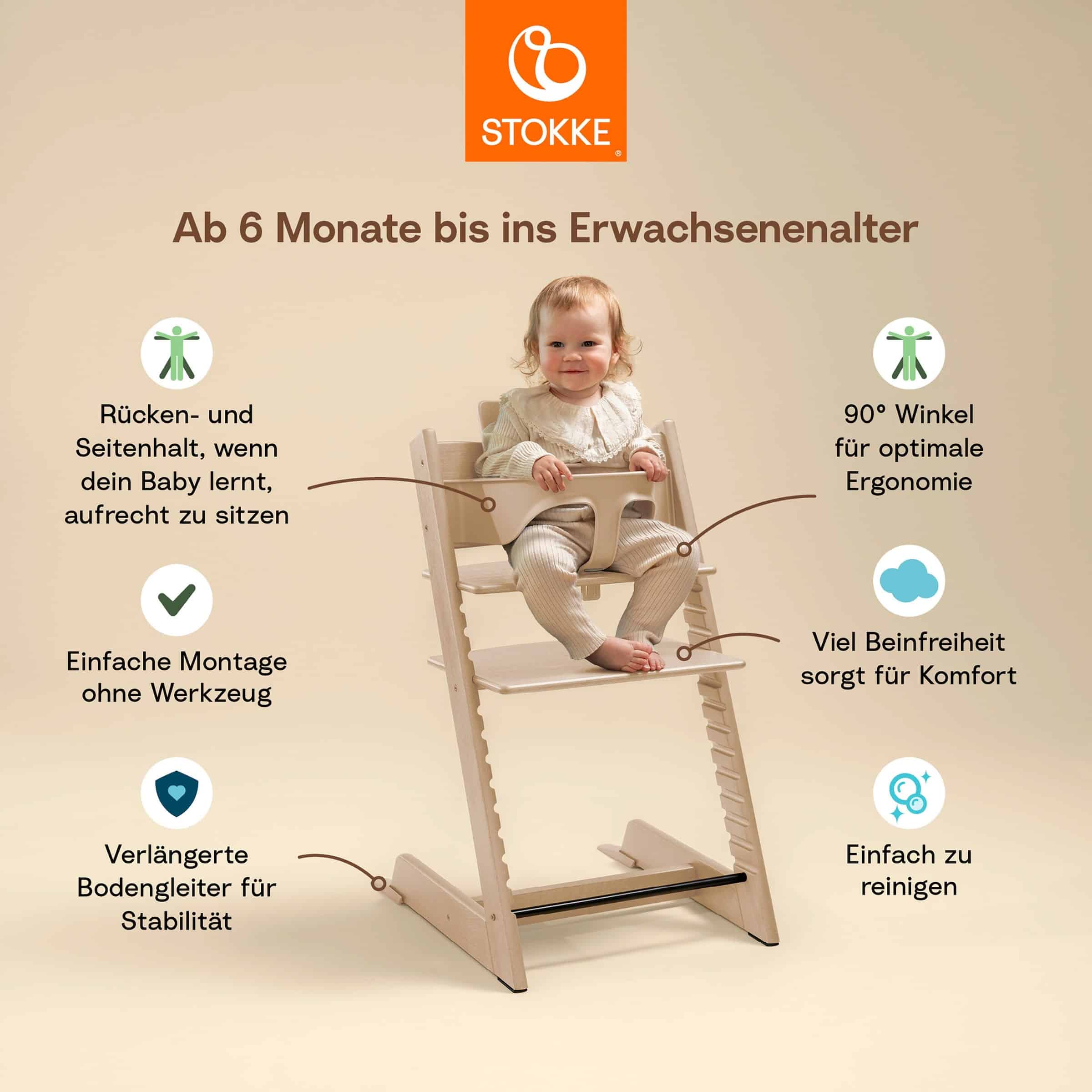 Der Stokke® Tripp Trapp® Bundle mit Babyset ist die ultimative Lösung für Eltern, die einen Hochstuhl suchen, der mit ihrem Kind mitwächst und dabei höchste Standards an Sicherheit, Komfort und Design erfüllt. Er bietet eine durchdachte Antwort auf die Herausforderung, einen sicheren und ergonomisch perfekten Sitzplatz für Ihr Baby ab den ersten Monaten zu schaffen, der nahtlos in ein voll funktionsfähiges Hochstuhlarrangement für Kleinkinder und ältere Kinder übergeht.