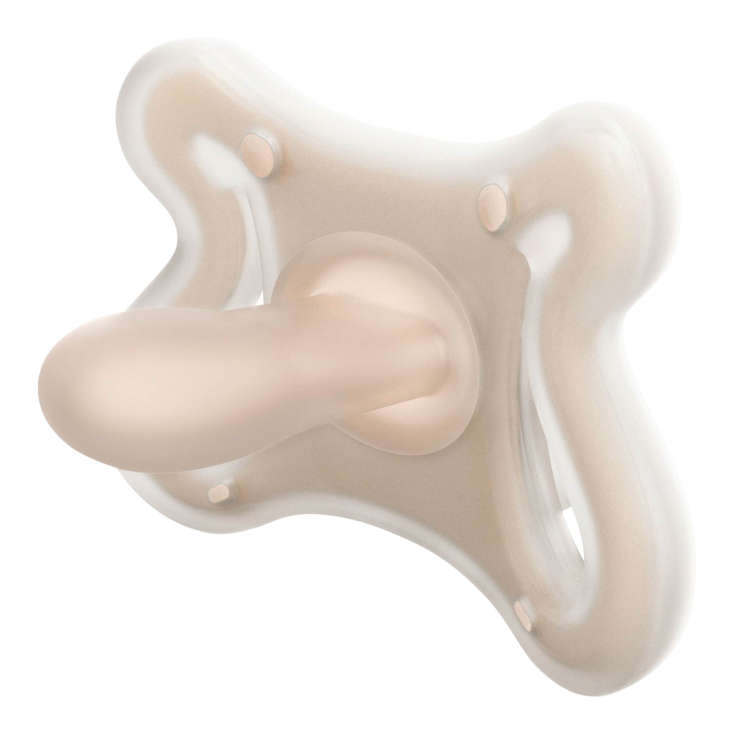 Der Hauptvorteil der speziellen, flachen und symmetrischen Saugerform ist die Unterstützung der natürlichen Kiefer- und Zahnentwicklung. Sie minimiert den Druck auf den Gaumen und fördert eine korrekte Zungenpositionierung, was potenziellen Fehlentwicklungen vorbeugt.