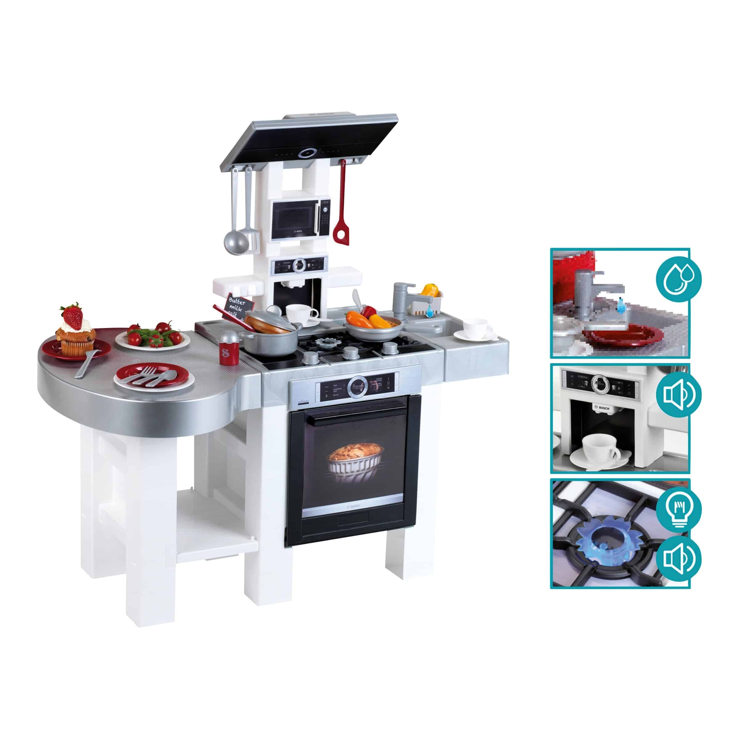 Die Theo Klein Bosch Kinderküche Modern Style imitiert reale Bosch-Küchen mit Funktionen wie drehbaren Kochplatten-Reglern, einem zu öffnenden Backofen mit Fenster, einer Spielspüle mit Wasserhahn und ausreichend Arbeitsfläche sowie Stauraum für Zubehör. Dies ermöglicht ein sehr authentisches Rollenspiel.