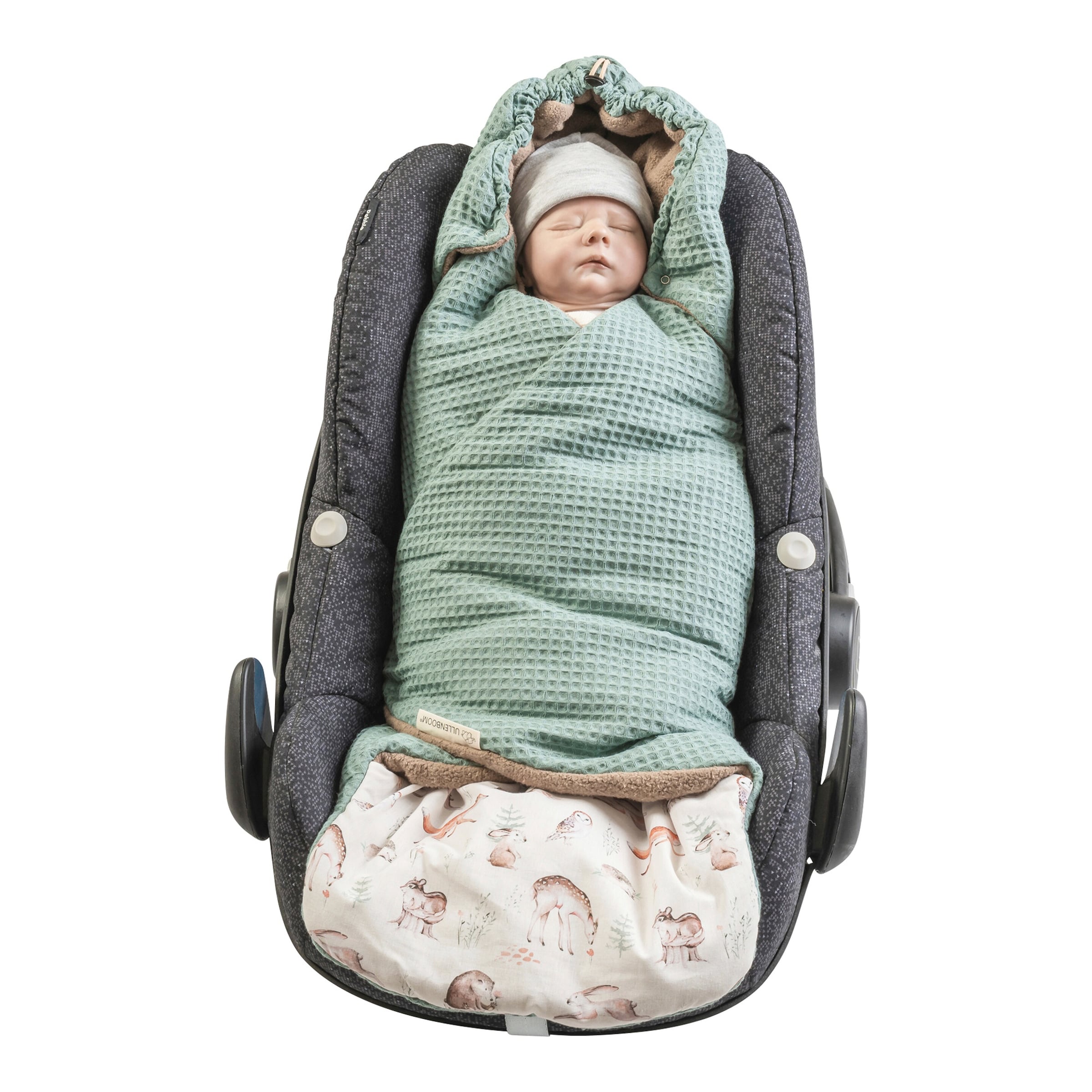 Wir raten von der Verwendung von dicken Einschlagdecken wie dieser im Autositz ab, da dies die korrekte und sichere Gurtführung beeinträchtigen kann. Für den Autositz sind spezielle Ensitzsysteme oder dünnere Decken besser geeignet, die die Gurtschlitze nicht blockieren.