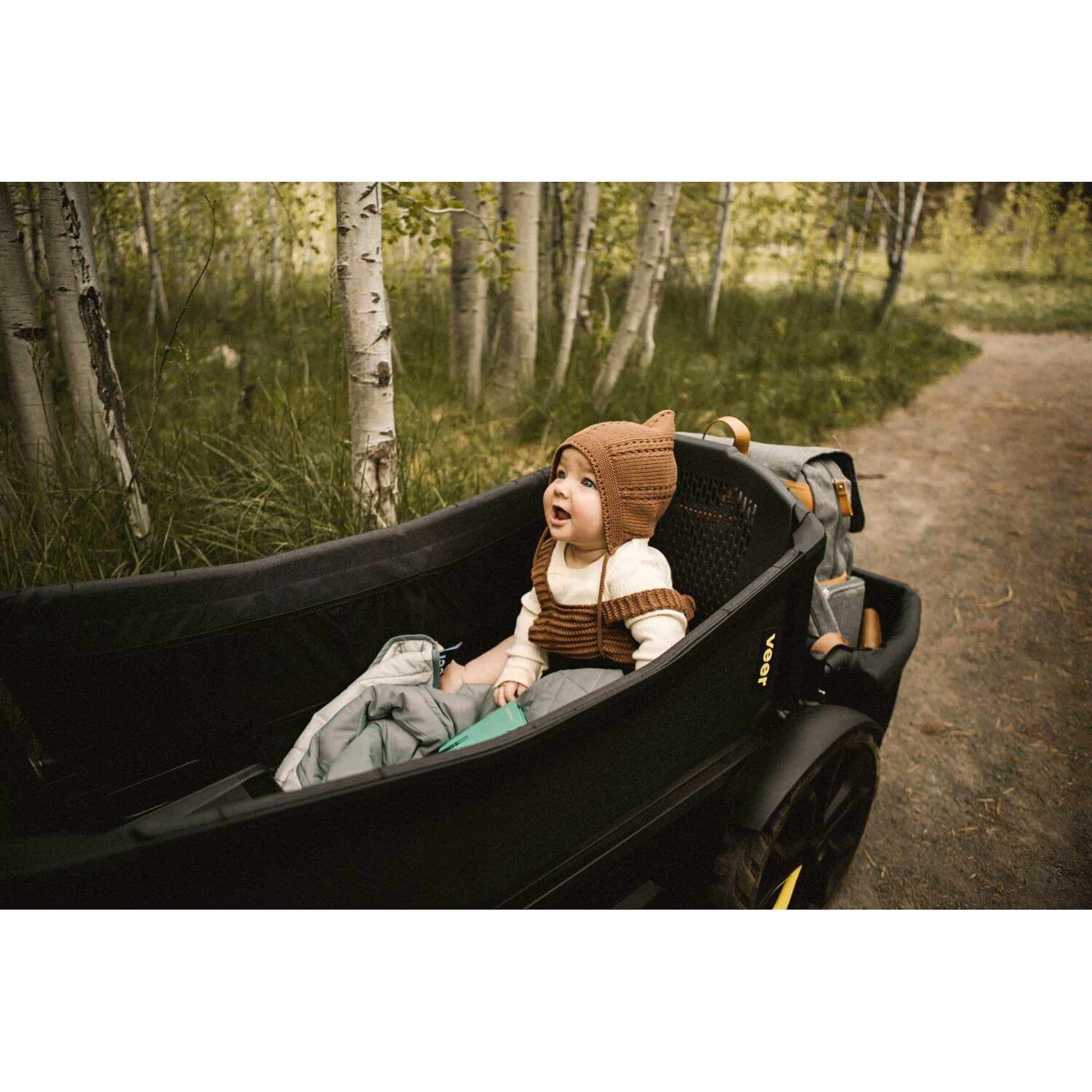 Der Veer Bollerwagen Cruiser ist für Kinder konzipiert, die bereits eigenständig sitzen können. Für jüngere Säuglinge empfehlen wir die Verwendung einer geeigneten Babyschale oder einer flachen Liegefläche, sofern diese kompatibel ist. Bitte prüfen Sie die spezifischen Produktinformationen zur Kompatibilität mit Zubehör für Neugeborene.